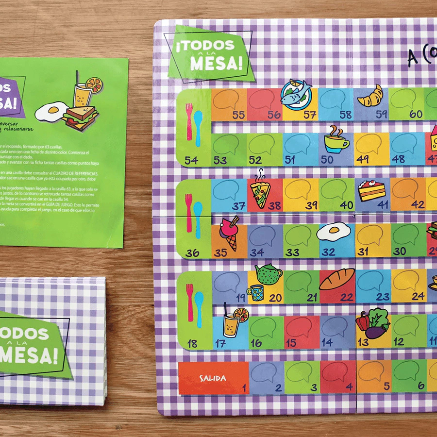 Todos a la mesa es un juego emocional, de conversación y de autoexpresión para todas las edades. Es una ocasión para compartir los pensamientos, expresar las emociones y afianzar la unión y el vínculo entre lxs jugadores. Contiene un tablero de cartón montado, y a medida que se va avanzando cada casillero invita a todxs lxs jugadores a charlar sobre distintas temáticas.