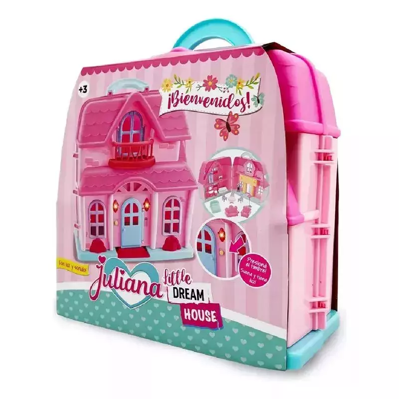 Juliana Casa Para Muñecas Little Dream House SISJUL105 Casa Desplegable Juliana Pequeña Casa de Ensueño Jugá a la casita con todos sus accesorios! Dormitorio super completo, cocina, comedor, living y baño! Y no te olvides de tocar el timbre antes de ingresar…. Hace luz y sonido! Incluye: 1 casita, 2 sillones, 1 mesa, 3 sillas, 1 cama, 1 televisor, 1 armario, 1 combo de baño, 1 bañera, 1 reloj y 1 lámpara. Edad recomendada: +3 años