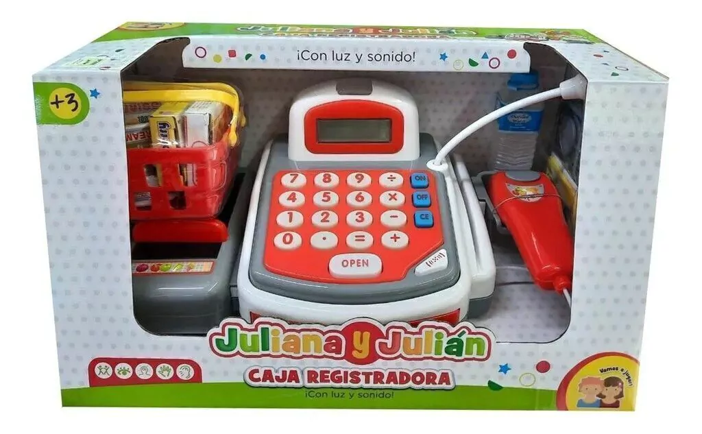 Con la caja registradora, podes pasar una tarjeta, scanner con luz y sonido, tiene cinta transportadora, abrí la caja presionando el botón, podes hablar con su micrófono y viene con muchos accesorios.