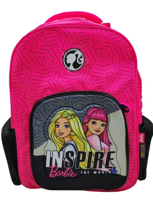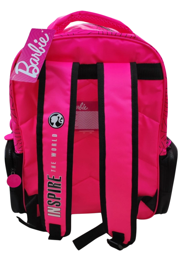 Mochila Barbie Shine On Espalda 17 pulgadas. Llega directo a la espalda de las pequeñas fanaticas, en este caso un estampado de alto nivel que se funde en un fondo bicolor degradado. En uno de sus laterales cuenta con un bolsillo de red y en el otro con el inconfundible logo de Barbie. Ademas un amplio compartimento principal mas otro que se le agrega por delante en la parte inferior. Ideal para regalar y para uso en educacion infantil. ¡Las pequeñas fanaticas brillan con Barbie!